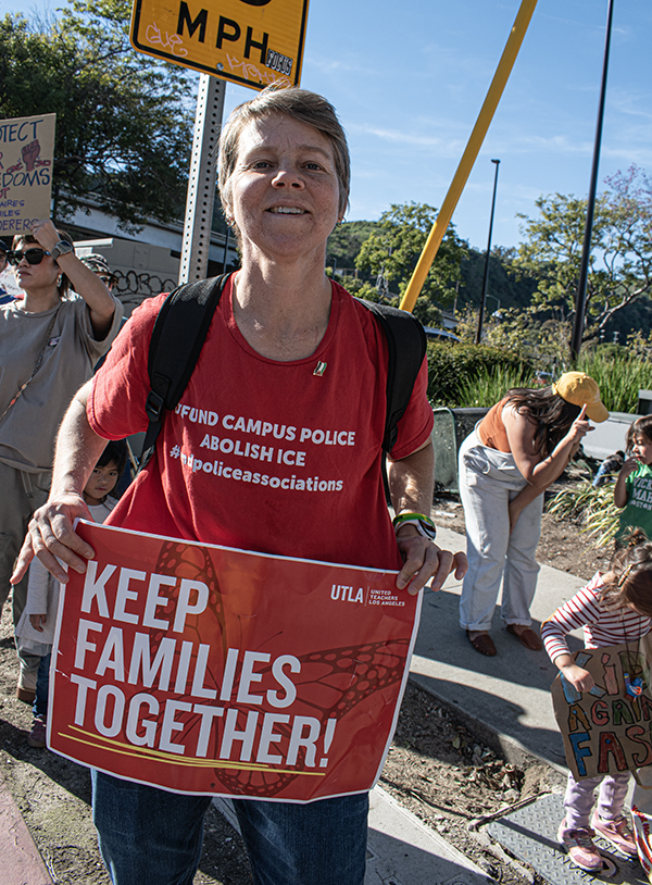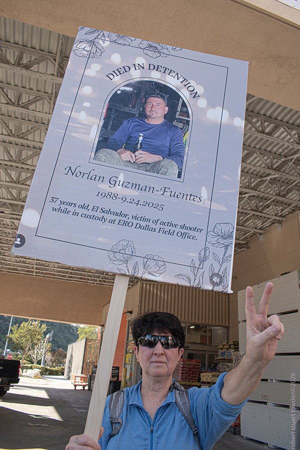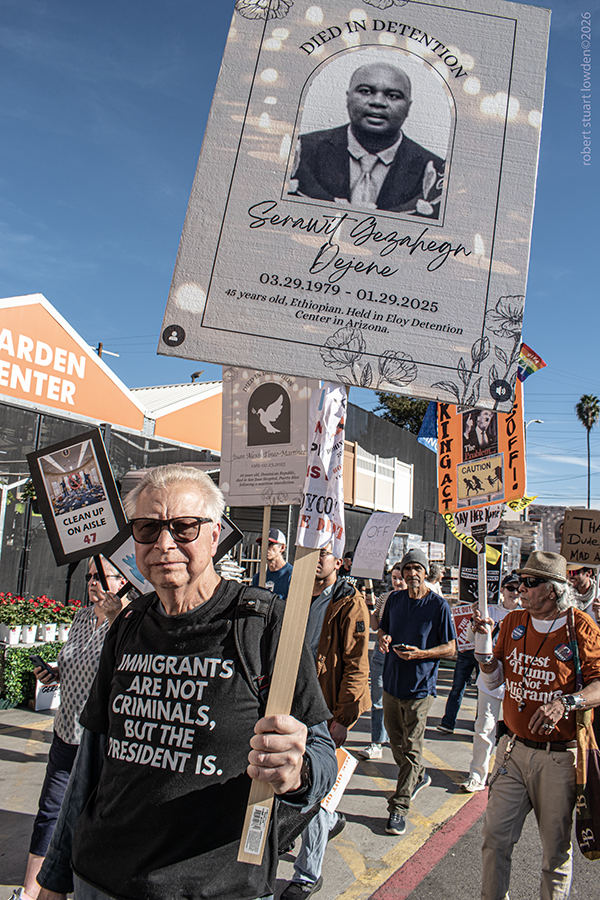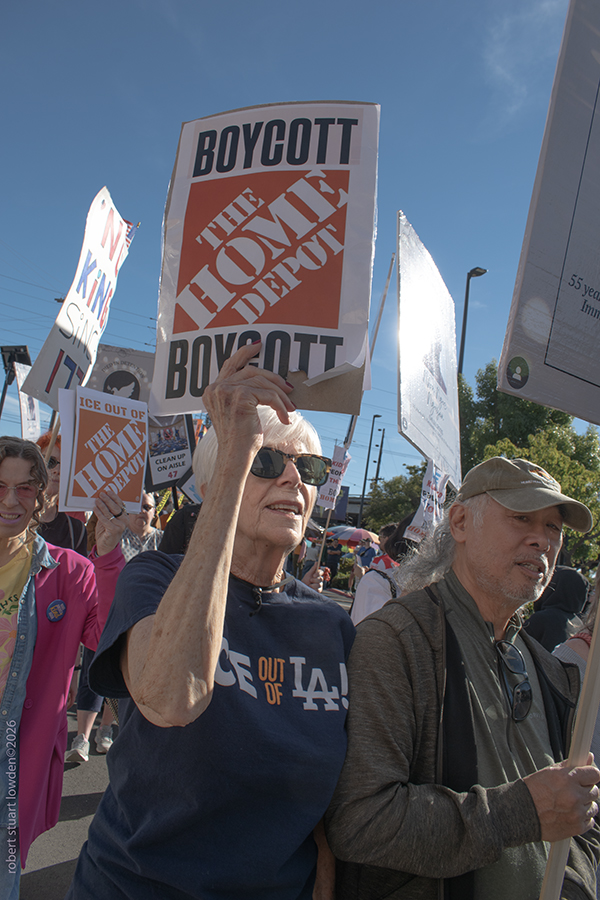 There was a very peaceful anti ICE rally ( consisting of perhaps a hundred people or so ), at the Cypress Home Depot in Los Angeles California on January 11th ,. The protest started on Figueroa and migrated to the store parking lot. Eventually a mild and controlled group of LAPD police barred the way to the protesters who were trying to enter the store with signage and shouted chants of “abolish ICE” The store locked their doors sealing customers in and the anti ICE people out. After voicing their concerns about ICE and DHS abuses to the attending officers, the doors reopened and the crowd dispersed as the afternoon drew to a close.