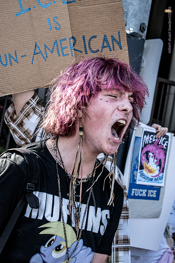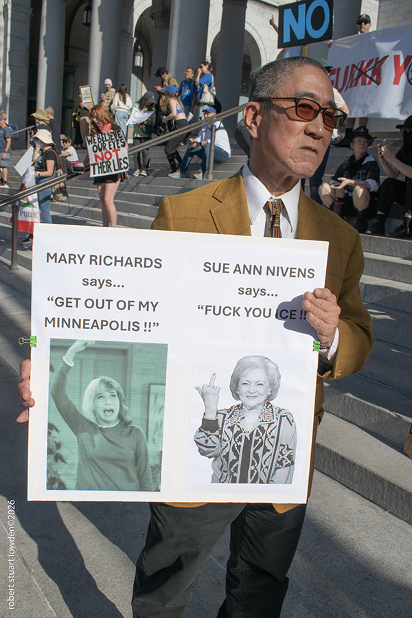 At City Hall People were scream-yelling and chanting new slogans about Donald Trump's outrages that ran from existential ICE complaints to Epstein condemnations to Venezuela and Greenland head jerks to signage with alarming objections to Trump's continuous attempts to rupture and slash the 238 year old United States Constitution.